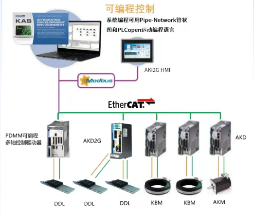 内置AKD驱动器作为主站,可控制7+个从轴驱动器,无需PLC即可构建多轴系统(最大支持128轴),集成完整I/O与人机界面。