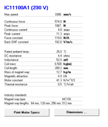 固晶台XY模组,上轴X轴负载45kg,下轴Y轴110kg,幅面达950mm*520mm。依据上述要求,选型出科尔摩根IC系列直线电机,X轴电机为IC11100A1TRP1,Y轴电机选用IC22200A1TRP1,峰值推力分别可达1067N/4156N。