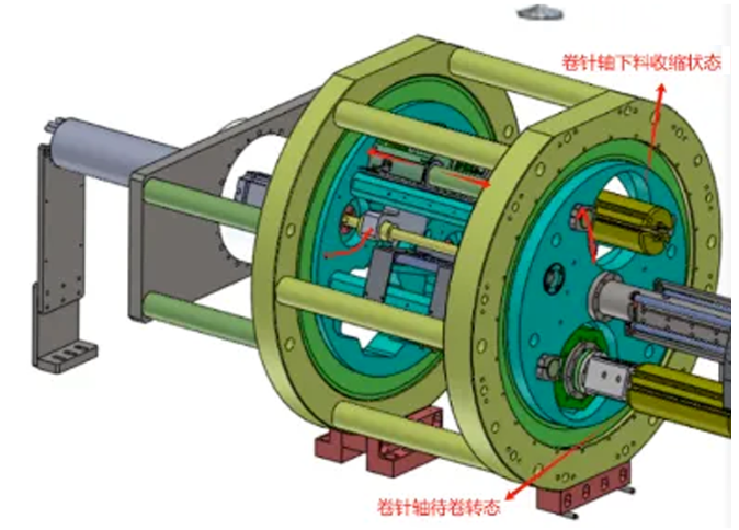 卷针与封装好的电机轴直接连接,省去了滑插轴等传动部件,当需要下料时通过电机或者气缸带动整个卷绕电机和卷针一起向滑环方向运动。这样的结构设计大大减少了卷针运动部分的负载,简化了设备结构。