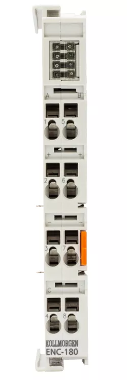 该端子是一个 24 V 输入接口,用于直接连接增量编码器。可以读取、设置或启用带正交解码器的 32 位计数器以及 32 位零脉冲锁存器。可以测量周期和频率。门输入支持锁定计数器,可选择用高电平或低电平。锁存器输入同样可以配置,并且可以评估高电平或低电平。AKT2G-ENC-180 支持分布式时钟,即输入数据可以与其他同样分布式连接到分布式时钟端子的数据同步采集。通用系统精度约 <100 ns。借助移动轴,微增量功能提供的轴位置分辨率比编码器实际提供的高 256 倍。AKT2G-ENC-180 还可用做通道 A 上的单通道 32/16 位计数器。这种情况下,通道 B 上的信号电平用于定义计数方向。