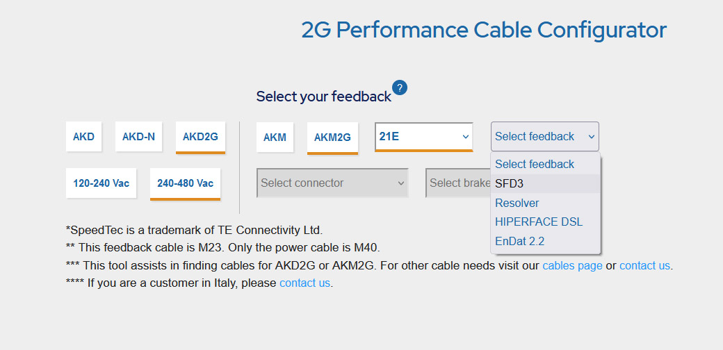 然而,2G 性能电缆配置器可以让您不用凭空猜测,并可为您提供完成伺服系统所需的确切电缆组或混合电缆。 使用配置器进行选择非常简单: